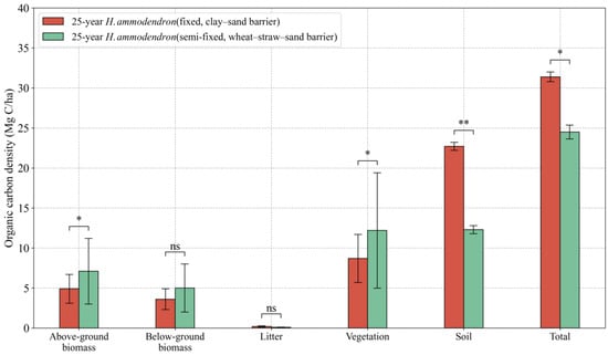 Sand barriers need to be built on mobile sand dunes before H. ammodendron is planted. Sand barrier type significantly affected organic carbon storage in the sand-fixing plantations. BC storage in the H. ammodendron plantation with wheat–straw–sand barrier reached 12.3 Mg C ha−1, which was significantly higher than that of BC storage in a similar site with a clay sand barrier. SOC and TC storage in the H. ammodendron plantation with a wheat–straw–sand barrier reached 12.3 and 24.6 Mg C ha−1, respectively, each of which was significantly lower than that of a plantation constructed with a clay sand barrier (Figure 8).