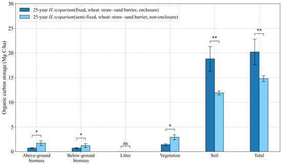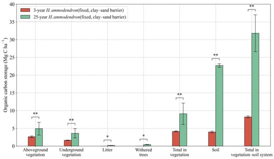 Effects of plantation modes (clay–sand barrier or wheat–straw–sand barrier) on the allocation of each C sink in H. ammodendron ecosystem. Values are means ± standard deviations (SD, n = 9). Asterisks denote statistically significant differences * p < 0.05, ** p < 0.01.