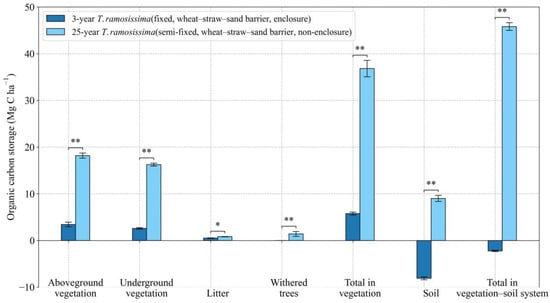 The 3-year T. ramosissima plots observed in this study acted as carbon sources. For comparison, 25-year-old T. ramosissima plantations act as significant carbon sinks. Every carbon pool in the 25-year T. ramosissima sand-fixing plantations is much higher than that of the 3-year T. ramosissima sand-fixing plantations (Figure 11). Among them, the organic carbon storage of above-ground biomass, below-ground biomass, and total carbon storage in vegetation in the 25-year T. ramosissima plantations are 5.3, 6.3 and 6.4 times that of the 3-year T. ramosissima plantation, respectively (Figure 11).