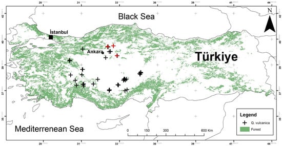 - Birol, S.Ö.; Özel, N.; Gugger, P.; Özkan, K. Endemik kasnak meşesinin (Quercus vulcanica [Boiss. and Heldr. ex] Kotschy) yeni bir yayılış alanı. Turk. J. For. 2020, 21, 6–14. [Google Scholar] [CrossRef]
