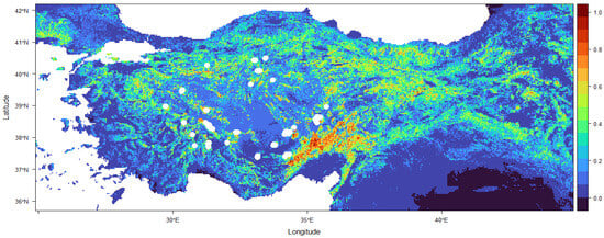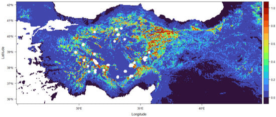 Average climate habitat suitability for the Kasnak oak projected to under the present-day climate conditions. The likelihood of occurrence varies from 0 (dark blue, representing low probability) to 1 (red, indicating the highest probability). White dots show occurrence records.