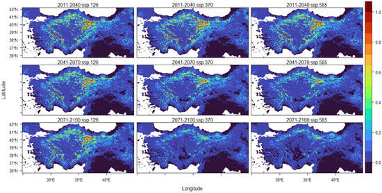 Average estimates of climate habitat suitability for Kasnak oak are shown under different future climate scenarios. The projections are presented for three time periods—2011–2040, 2041–2070, and 2071–2100—and three shared socioeconomic pathways: optimistic (SSP126), intermediate (SSP370), and pessimistic (SSP585). For the explanation of other designations, please see Figure 2).