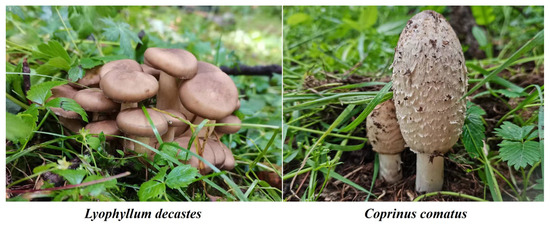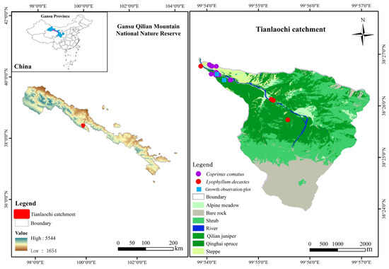 The Qilian Mountains are located at the intersection of the Qinghai–Tibet Plateau, the Loess Plateau, and the Mengxin Plateau and are one of the most famous mountain ranges in China. The study area was selected in the Tianlaochi catchment (99°53′50″–99°57′10″ E, 38°23′58″–38°26′56″ N) of the upper reaches of the Heihe River of the Qilian Mountains. The area covers an area of approximately 12.8 km2, with elevation ranging from 2600 m to 4450 m above the mean sea level. The climate type is alpine climate. The mean annual temperature was 0.6 °C. The mean annual precipitation was 437 mm, and rainfall mainly occurred from June to September (about 84.2% of annual rainfall) [27]. The average annual evaporation and average annual relative humidity were 1066 mm and 59%, respectively. The study area is rich in species, and the main dominant forest species are Qinghai spruce and Qilian juniper. Qinghai spruce forest covers 25.39% of the land area in the catchment and is distributed on the north face at elevations of 2600 to 3540 m. Qilian juniper forest covers 13.34% of the land area in the catchment and is distributed on the south face at elevations of 2700 to 3250 m [28]. The temperature and humidity in summer are suitable for Qinghai spruce forests, which provide the necessary conditions for the growth and development of the species (Figure 2). There are a large number of macrofungi distributed in the forest, such as Lactarius batsudata, L. lilacinus, Agaricus, L. decastes, C. comatus, Stropharia rugosoannulata, Lepista personata, Agaricus perrarus, Agaricus spissicaulis, Agaricus heamorrhoidarius, etc. L. decastes and C. comatus are two edible mushrooms (Figure 1) and are more commonly distributed in the forest (Figure 2). C. comatus is typically white and has a height ranging from 6 to 15 cm. The pileus length is 5–10 cm, and it is initially egg-shaped and gradually opens into a long bell [29]. The optimal temperature range for the growth of mycelium is 22–28 °C. The ideal pH range for growth falls between 7.0 and 7.5. Fruiting bodies take approximately 5–8 days to mature. It is important to note that C. comatus is highly perishable, and autolysis (self-decomposition) occurs widely in its fruiting bodies after maturity [30]. On the other hand, the fruiting body of L. decastes can be solitary or clustered. Its pileus diameter is generally 5–16 cm, and the stipe length is typically 6–10 cm. The mycelium of L. decastes can grow within a temperature range of 5–35 °C. The optimal pH range for its growth is 6.5–7.5 [31,32].