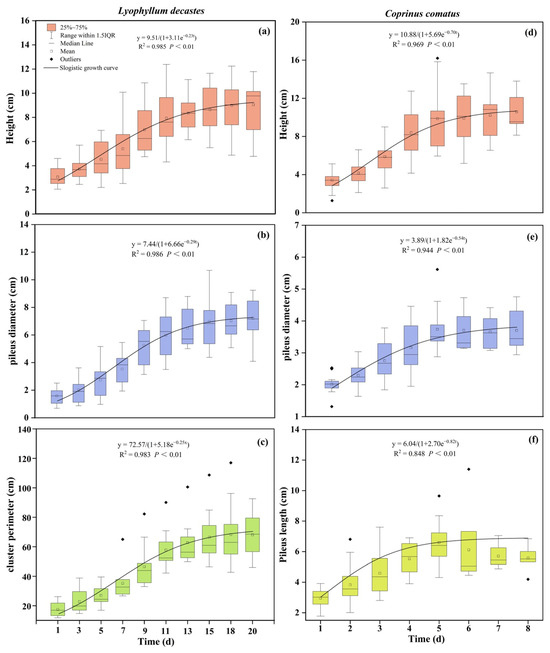 Changes in the growth of two species of mushrooms over time. (a–c) represent the growth curves over time for the height, pileus diameter, and cluster perimeter of L. decastes, respectively. (d–f) represent the growth curves over time for the height, pileus diameter, and pileus length of C. comatus, respectively.