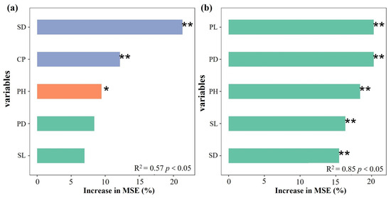 The importance ranking of independent variables affecting mushroom biomass in the RF model. (a) and (b) represent L. decastes and C. comatus, respectively. CP: cluster perimeter; PH: height; PD: pileus diameter; SL: stipe length; SD: stipe diameter; PL: pileus length. * and ** indicate p < 0.05 and p < 0.01, respectively. Increase in MSE (%): percentage of increase in mean square error.