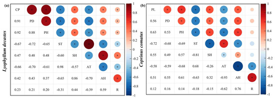 Pearson’s correlation between agronomic trait growth of mushrooms and environmental factors. (a) and (b) represent L. decastes and C. comatus, respectively. CP: cluster perimeter; PH: height; PD: pileus diameter; PL: pileus length; ST: land surface temperature; SH: near-surface relative humidity; AT: air temperature; AH: air relative humidity; R: rainfall. Bubble area represents the absolute value of correlation matrix. Red: positive correlation coefficient. Blue: negative correlation coefficient. * indicates p < 0.05.