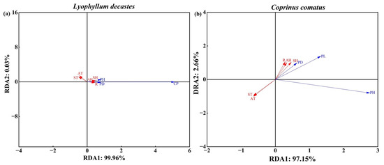 RDA of environmental factors and three major agronomic traits. Red solid arrows represent environmental factors, and blue arrows represent agronomic traits, respectively. The cosine of the angle between the two rays indicates their correlation. (a) and (b) represent L. decastes and C. comatus, respectively. CP: cluster perimeter; PH: height; PD: pileus diameter; PL: pileus length; ST: land surface temperature; SH: near-surface relative humidity; AT: air temperature; AH: air relative humidity; R: rainfall.