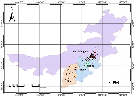 The data for the sample plots were obtained from the 6th National Forest Inventory of China, which was conducted between 1999 and 2003 in four provinces, namely, Beijing, Hebei, Inner Mongolia, and Shanxi Provinces (Figure 1). These plots are rectangular with an area from 0.06 ha to 0.08 ha in different provinces listed in Table 1. Only Larix principis-rupprechtii plantations that had not been harvested were chosen for this study. There were 213 plots in the dataset, with a total of 9980 trees. The plots that were examined were rectangular in shape and had areas that varied between 0.06 and 0.08 hectares in different provinces. The primary variables under investigation in the plots were tree diameter at breast height (DBH) greater than 5 cm, average age of the stand, average height of the trees, canopy closure, slope position, aspect, slope, elevation, soil thickness, and soil type. Other stand variables, such as the stand basal area (BA), quadratic mean diameter (QMD), density stems (S), minimum diameter (MinD), maximum diameter (MaxD), stand average age (SAA), average height (AH), and stand site index (SI), were derived from tree list measurements. The site indices were computed based on the model proposed by Zang et al. (2016) [10] in the literature. The summary statistics of the variables pertaining to the stand are presented in Table 1.