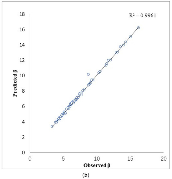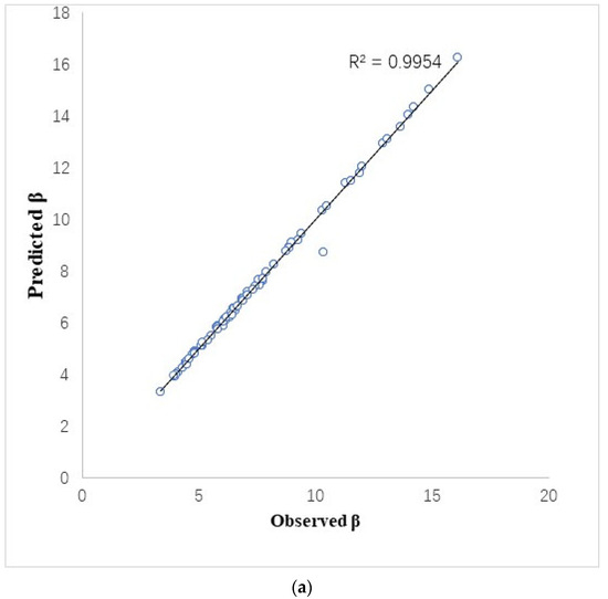 Observations and predictions of parameter β: (a) models without soil variables and (b) soil-sensitive models. The line represents the linear relationship between the predicted and observed values of the β parameter.