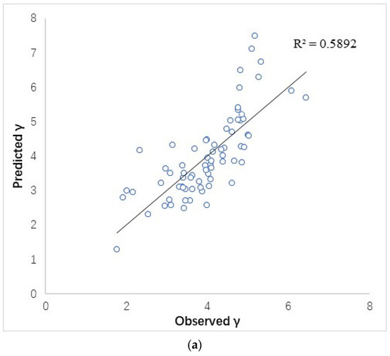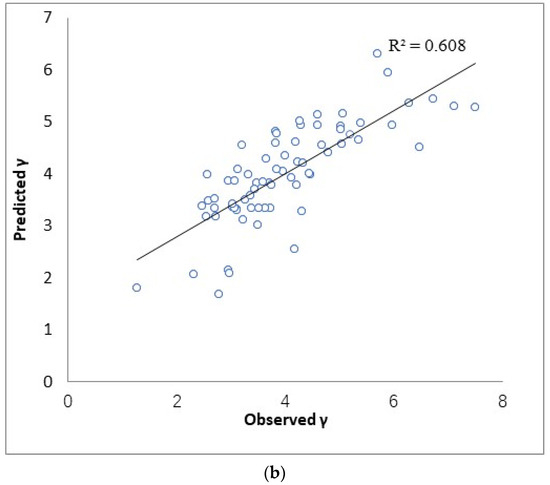 Observations and predictions of parameter γ: (a) models without soil variables and (b) soil-sensitive models. The line represents the linear relationship between the predicted and observed values of the γ parameter.