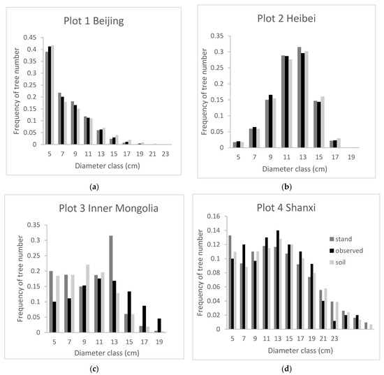 The distribution of tree diameter is influenced by intricate interactions among environmental, stand, and tree factors. Despite the existence of various diameter class distribution models [33], the incorporation of soil variables has been infrequently observed. In this research, a soil-sensitive diameter distribution model was developed using the SUR method. This method was employed to incorporate stand and soil variables into the model, aiming to improve the performance parameters for Larix principis-rupprechtii plantations in northern China. In our study, the model incorporating both stand and soil factors exhibited superior performance compared to the model that included only stand factors as predictors. Compared to Equation (13), the adjusted R2 value improved (16.0% for γ), while the RMSE decreased (3.5% for β and 10.4% for γ). Compared with the model not considering soil factors, the model considering soil factors increased the AIC for both parameter β and parameter γ. The absolute error index (E) for both the mean value and maximum value decreased with increasing soil factors in the four provinces. From the perspective of adjustable R2, AIC, RMSE, E1, and E2 values, the inclusion of stand and soil factors in the tree diameter distribution model enhanced its performance compared to that of the model that did not consider soil factors. Figure 4 shows the observed and fitting distribution with only stand factors and with the inclusion of stand and soil factors for four plots from Beijing, Heibei, Inner Mongolia, and Shanxi. We also can obtain the result that the fitting distribution with the inclusion of stand and soil factors is improved. The soil-sensitive diameter distribution model is proven to be effective and accurate.