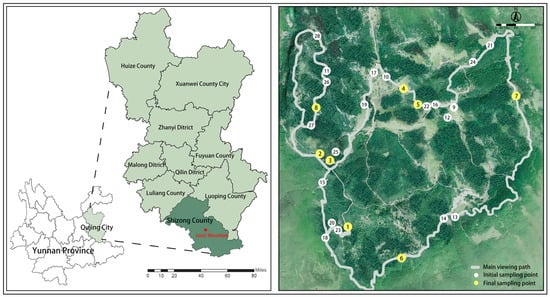 The study site is located in Junzi Mountain, Shizong County, Qujing City, Yunnan Province, Southwest China (104°16′ N, 24°63′ E) (Figure 1), and it has a northern subtropical climate. Occupying about 12 km2, the scenic area’s highest elevation is 2409.7 m and forest cover is about 68.8%.
