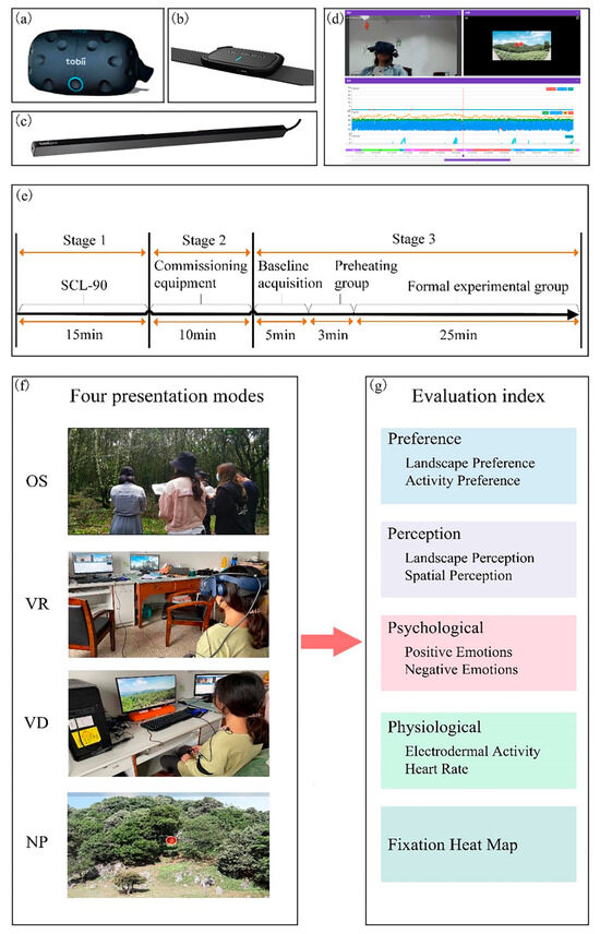Procedure. Notes. (a) Tobii Pro VR eye-tracking device (VR group), (b) ErgoLAB V3.0 smart wearable human factors physiological recorder; (c) Tobii Pro Fusion virtual reality eye-tracking device (VD group, NP group); (d) ErgoLAB V3.0 human-computer environment synchronization platform; (e) Flowchart of experimental design; (f) Experimental Groups. OS: On-site group, VR: Virtual reality panorama group, VD: Video group, NP: Normal photo group. (g) Experimental monitoring index.
