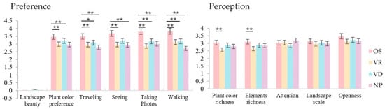 In the public preference, there was no significant difference among the four visual methods of “Landscape beauty”. In the indicator of “Plant color preference”, there was no significant difference between the on-site group and the video group (p > 0.05), while the remaining two indoor groups were both highly significantly different from the on-site group (p = 0.000), with the on-site group having a higher mean value. Among the activity preferences, only the video group was not significantly different from the on-site group in “Seeing” (p > 0.05), while the remaining two indoor groups were both significantly different from the on-site group (p = 0.000). In terms of the mean value, the on-site group had the highest value in all activity preference indicators, while the video group’s value was closer to it.