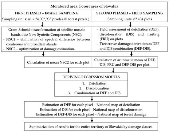 In this study, we implemented a two-phase sampling method combined with regression, following the flowchart outlined in Figure 3. The goal of the first phase was to estimate forest damage quickly and cheaply from satellite images, i.e., to reduce the overall cost of data collection. The second phase’s aim was to refine the estimation using the field-based defoliation assessment on monitoring plots, i.e., to improve its accuracy. The values from the refinement of forest damage (DEF, DIS, and DEF-DIS) obtained from regression analyses were rescaled to the range from 0% (healthy stands) to 100% (dead stands).