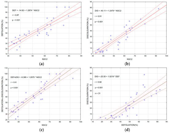 Refinement of forest damage estimation in the 2nd phase according to field assessments in Slovakia. Spectral reflectance models for (a) defoliation; (b) discolouration; and (c) defoliation- discolouration. X-axis: NSC2 component. (d) Relationship between defoliation and discolouration. The shown confidence intervals are at the 95% level.