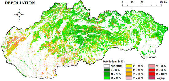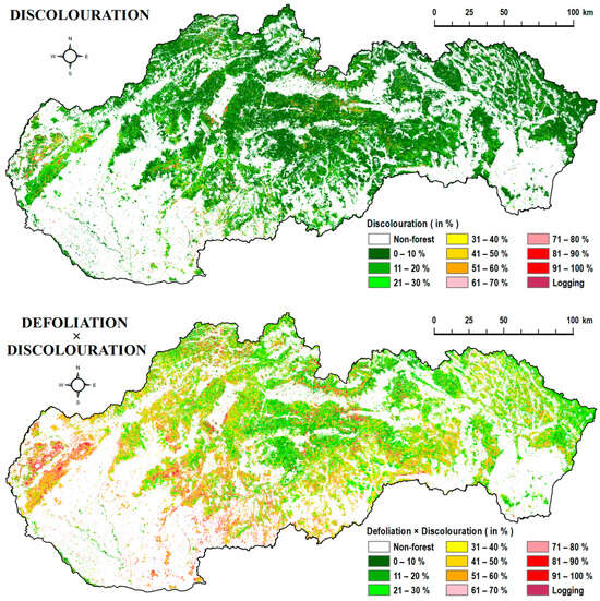 For the evaluation of the proposed approach across the entire area of Slovakia, the derived reflectance models (Table 5) were applied to all pixels classified as forests according to the study []. This forest mask was created using satellite data from 1995 to 1996. Since forests change over time, the mask includes all stages of forest’s life, such as logging, natural disasters, and regrowth. The mask is consistently used in our forest health (FH) analyses, allowing us to perform reliable and comparable FH analyses on the same acreage. The analysed area was 2,160,264 ha (Table 6). The classification accuracy can be assessed by regression analysis parameters (the correlation coefficient and the standard error of the estimate). Utilizing field assessments of defoliation in 2022, we obtained the correlation coefficient between the first and second phases of 0.87. The standard error of the estimate (SEE) was ± 10.7%. This implies that if the determined defoliation is 30%, the actual value can range from 19.3% to 41.7% with 68% confidence. The standard errors of the estimate for discolouration and the coupled symptoms can be interpreted similarly. In both cases, the error was lower than that of defoliation, namely ±8.4% for discolouration and ±9.7% for the coupled symptoms (Table 5).