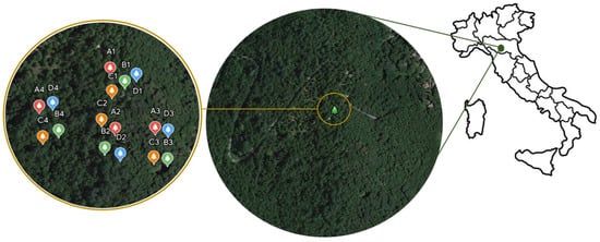 Map of the study area showing the localization of selected chestnut trees. Red marks (group A) represent intensely pruned trees, green marks (group B) represent medium-pruned trees, orange marks (group C) represent low-pruned trees, and blue marks (group D) represent control, not pruned trees.