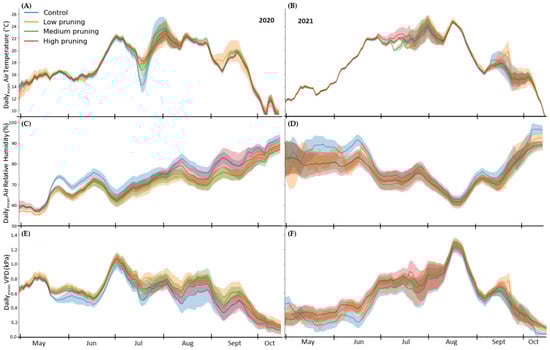 Daily values of air temperature (A,B), relative air humidity (C,D), and vapor pressure deficit (VPD) (E,F)of the studied trees during the two growing seasons of 2020 and 2021. Solid lines represent daily mean values recorded by single TTs installed in the four replicates for each pruning treatment, while the shaded area around solid lines represents the standard deviation.