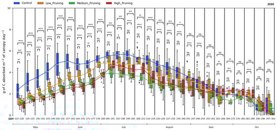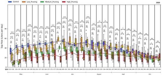 Comparing the effect of pruning treatments (low, medium, and high) with respect to control (no pruning) on sap flow across the days of the year (DOY) during the vegetative cycle of 2020. Each box includes daily values in the range between the 25th and 75th percentiles of seven days of the four replications per treatment; whiskers extend to the 10th and 90th percentiles; and dots are outliers. The yellow line in each box represents the median value, while the continuous line joins the mean values of each box of the same treatment. The p-value of the Two-sided Mann-Whitney-Wilcoxon test is reported above the corresponding pair of boxplots, with ns (non-significant) when p ≥ 0.05; * when 0.01 < p ≤ 0.05; ** when 0.001 < p ≤ 0.01; *** when 0.0001 < p ≤ 0.001, **** when p ≤ 0.0001.