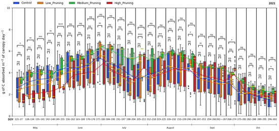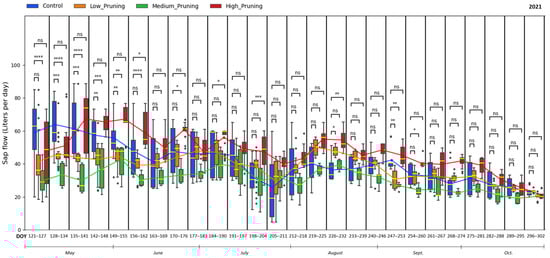 Comparing the effect of pruning treatments (low, medium, and high) with respect to control (no pruning) on sap flow across the days of the year (DOY) during the vegetative cycle of 2021. Each box includes daily values in the range between the 25th and 75th percentiles of seven days of the four replications per treatment; whiskers extend to the 10th and 90th percentiles, and dots are outliers. The yellow line in each box represents the median value, while the continuous line joins the mean values of each box of the same treatment. The p-value of the Two-sided Mann−Whitney−Wilcoxon test is reported above the corresponding pair of boxplots, with ns (non-significant) when p ≥ 0.05; * when 0.01 < p ≤ 0.05; ** when 0.001 < p ≤ 0.01; *** when 0.0001 < p ≤ 0.001, **** when p ≤ 0.0001.
