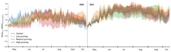These findings clearly demonstrate that pruning treatment initially affects the sap flow, with a reduction in water use in the trees during the first months after woody removal, which, however, regains usual values at the end of the first growing season and completely realign during the following year. Studies in the literature, in fact, show that pruned trees mostly rebuilt their crowns after a year of development [115,117].