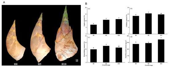 3.1. Changes of Lignin, Cellulose, Hemicellulose and Flavonoid Contents of Green Bamboo Shoots at Three Growth Stages