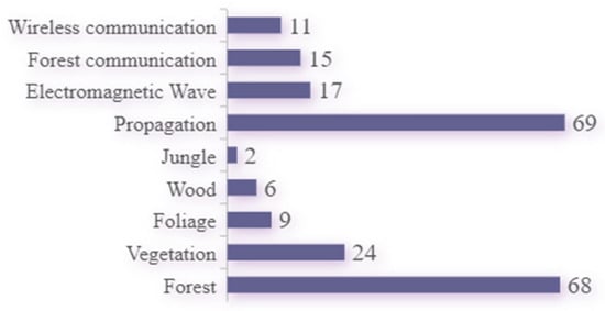 - “Propagation” and “Forest” are the most frequently occurring keywords, mentioned 69 and 68 times, respectively. This suggests that they are central concepts in the field of forest electromagnetic wave propagation. “Electromagnetic Wave” appeared 17 times and “Forest communication” 15 times, indicating their relative importance in the research, though not as primary focuses. By contrast, “Wireless communication” (eleven mentions), “Foliage” (nine mentions), and “Wood” (six mentions) are less frequently mentioned, possibly indicating a lower focus on these terms in forest electromagnetic wave propagation research.