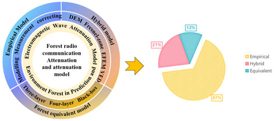 There is a limited study on forest communication model frameworks, as per the summaries of the reviewed articles. It can be inferred that the research encompasses a range from empirical models (e.g., “Empirical Model” and “Forest radio Communication Attenuation and attenuation model”) to more theoretical and possibly simulation-based approaches (e.g., “DEM correcting” and “Wave Attenuation Model for Forest”). This progression reflects a trend from data-driven practical models to more complex, comprehensive models that might incorporate Digital Elevation Models (DEMs) and calculate wave attenuation in different forest layers. The adjacent pie chart (Figure 2) shows the proportion of studies classified into three types: empirical (67%), hybrid (21%), and equivalent (12%). This distribution suggests that a small portion of the research, labeled as equivalent, refers to the use of existing models or methodologies in new environments or adapting them to specific types of forests. Such studies seem to have plateaued around the year 2000, and the derivation of empirical formulas is inseparable from fundamental scientific research. The majority of the studies are empirical, possibly focusing on data and direct measurements observed in forest environments to develop models that can predict signal attenuation. A significant portion of the research is classified as hybrid, which may imply the development of new methodologies, application of new technologies, or introduction of original models in forest electromagnetic wave propagation research.