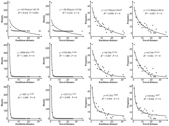 3.3. Distance Decay of Visitation Density and Visitation Frequency