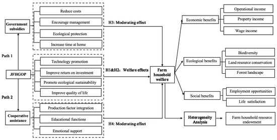 Given that the JFHGOP can enhance the welfare of farm households in economic, ecological, and social aspects, how does it contribute to the improvement of farm household welfare? This paper elucidates this through two pathways: government support and cooperatives’ assistance (Figure 1).