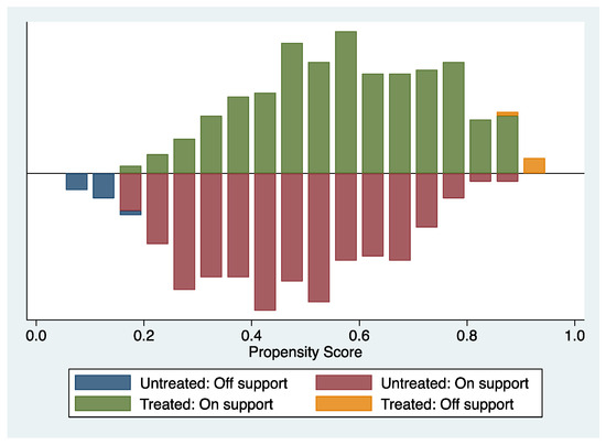 The use of the PSM method relies on another critical assumption: the balance test. This test requires that there be no systematic differences between the treatment and control groups across various matching variables after matching. Table 5 presents the results of the balance test for explanatory variables before and after matching. Following the matching process, all parameters showed a decrease, and the p-values of likelihood ratio tests indicated that the mean differences in covariates between the paired samples were no longer significant. Therefore, the total bias in the samples significantly decreased after matching, indicating that the balance test was successful.