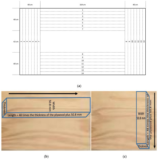 This procedure was applied to both complete plywood boards and specimens. The idea of applying it to complete boards is to verify whether there is a need to also make specimens or if only the measurements on complete boards are sufficient. For each treatment, three plywood boards were evaluated for each nominal thickness, and 28 specimens were obtained from each board (Figure 1a), 14 in a parallel direction and 14 in a perpendicular direction, prepared in accordance with the ASTM D 3043 standard [18], which indicates that the dimensions of the specimens must be equal to the nominal thickness × 50.8 mm wide; the length will depend on the direction in which they are made with respect to the face of the plywood board, this is 48 times the nominal thickness in the parallel direction (Figure 1b) and 24 times in the perpendicular direction (Figure 1c).