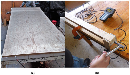 For the plywood boards, three measurements were made, one in the center and the other two 20 cm from each of the ends, both in a parallel and perpendicular direction (Figure 2a). For the specimens, only one measurement was made in the center of each of them (Figure 2b). The elastic modulus was determined with Equation (1):