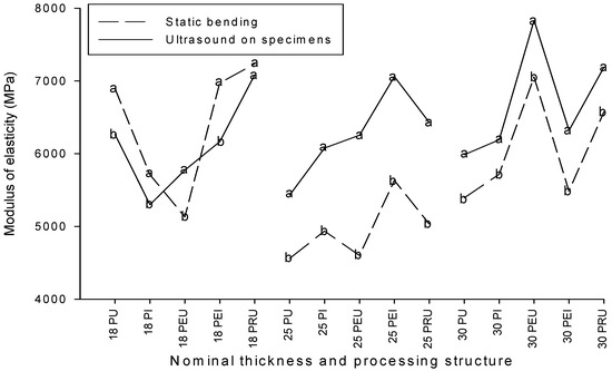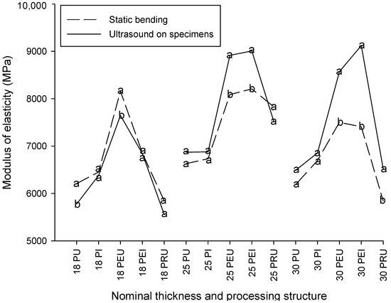 In the thickness of 18 mm in a parallel direction, it was observed that only in the PRU manufacturing structure, there was no evidence of statistical differences in terms of the evaluation method; in three of the four structures where there were statistical differences, the value of the elastic modulus obtained by ultrasound was lower than that determined by static bending, only in the PEU structure was the value determined by ultrasound higher. This behavior of the elastic modulus in the structures can be attributed to the thickness of the board; since for the 25 and 30 mm boards, the behavior was inverse. In this sense, in a study where they used different dimensions of test pieces for the same species to evaluate the influence of the dimensions in the calculation of the dynamic characteristics of the wood, they found that the parameters determined with the same device were different, assigning this behavior to the variation in the dimensions of the wood samples and mentioning that in wood sciences each procedure must be referred to a particular case [27,28].