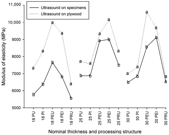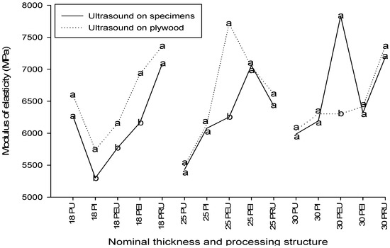 Ultrasound in a perpendicular direction. PU = pine-adhesive veneer urea formaldehyde, PI = pine-adhesive veneer with the company’s own formulation, PEU = pine–eucalyptus veneer adhesive urea formaldehyde, PEI = pine–eucalyptus veneer adhesive with the company’s own formulation, PRU = recovered sheet metal–urea formaldehyde adhesive. Equal letters between elastic modulus in specimens and complete boards for each structure by thickness are not significantly different, Tukey α = 0.05.