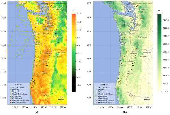 Geographic variation in mean annual temperature (MAT) over the decade 2011–2020 (a) and mean annual precipitation (MAP) during the same period (b) across the PNW. Each dot indicates a progeny testing site, color-coded by testing program, included in this study.