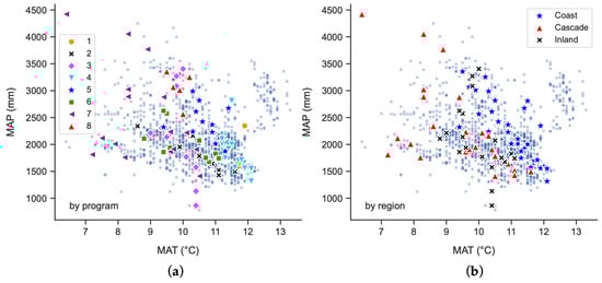 MAT and MAP patterns for parent trees (shown as faded dots) and testing sites (represented by colored symbols): (a) categorized by testing program; (b) grouped by geographic region (Coast, Inland, and Cascade).
