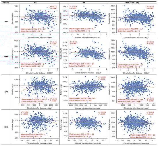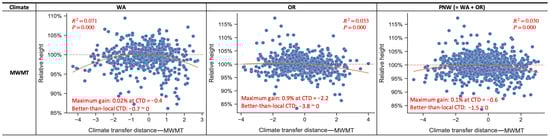Significant transfer functions were obtained for western WA, western OR, and the PNW region with a statistical significance of p ≤ 0.05 (Figure 3). However, the values of goodness of fit (R2) were generally low (≤0.2). Among the five climate variables studied, the two temperature-related variables, MAT and MCMT, exhibited relatively higher R2 values in explaining height growth at age 12 compared to the other variables. In WA, for example, populations with a −2.8 °C < CTD for MAT < 0 °C performed better than the local population, with a maximum age-12 height gain of 1.0% at CTD = −1.5 °C. This suggests that moving parents or populations from slightly warmer to cooler areas could result in up to 1% gain in age-12 height growth. Similar patterns were observed in OR and the PNW, where moving parents or populations from areas with ≤3 °C warmer temperatures tended to have up to 1% gain in height. Conversely, the three drought-related climate variables (MAP, SHM, WMWT) in WA seemed to follow the expected “local-is-best” patterns for growth. For example, CTD for MAP ranged from −3100~2900 mm, and little differences in growth were observed between populations from areas that were 1000 mm wetter or drier than the local area. In OR and the PNW, however, moving populations from a slightly wetter or lower summer temperature tended to perform slightly better, although such patterns were very weak (R2 ≤ 0.04).