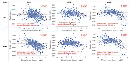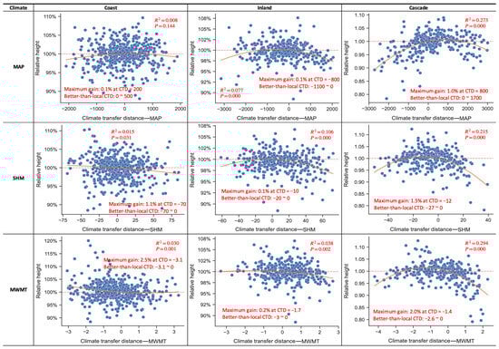 Apart from analyzing the impact of climate on height growth at the state level, we also delved into the matter by region (i.e., Coast, Inland, and Cascade, Figure 4). The transfer function patterns for MAT and MCMT were akin to those observed at the state level, but they exhibited greater strength, as indicated by the higher R2 values, with the highest being 0.448. In the Cascade region, populations migrating from areas with up to 3.5 °C higher MAT or 4 °C higher MCMT grew at least as rapidly as the local population. The predicted maximum height gain was approximately 2.3% at a CTD of −1.7 °C for MAT or MCMT, with an R2 value greater than 0.4. Climatic gradients in temperature and precipitation are steep in the Cascades, both in western WA and western OR, primarily associated with steep gradients in elevation. In the Coast region, maximum height gains (up to 2%~5%) were predicted at a CTD = −1.8 °C for MAT and −4.5 °C for MCMT, with R2 between 0.3 and 0.4. In the Inland region, however, only minor height gains (≤0.3%) could be achieved when moving populations from slightly warmer areas. Regarding the MAP, SHM, and MWMT variables, populations from areas in the Cascade region experiencing moderate summer drought demonstrated better growth, with R2 values ranging from 0.2 to 0.3 and maximum height growth gains of 1%~2%. In other regions, transfer functions for these variables were either weak (R2 ≤ 0.03) or showed <0.3% maximum height growth gain.