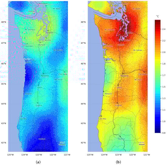 Projected increases in MAT from 2015 to (a) 2055 and (b) 2085 in the PNW.