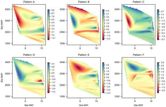 Patterns of family growth response to climate variables (MAT and MAP) across testing sites. Fifty full-sib families from each of the top, middle, and bottom groups, categorized based on predicted genetic gains for height at age 12, are sampled to examine family response patterns to climate change. The color scale represents the predicted genetic gain (%) of age-12 height growth over population means. (1) Pattern (A): families perform best with an MAP of about 2000 mm and prefer a higher MAT. (2) Pattern (B): families reach peak performance either at a low MAT with MAP between 2200 and 3600 mm, or with MAT around 10 °C and MAP around 2300 mm. (3) Pattern (C): similar to (A), families thrive either with MAT above 8.3 °C and MAP around 2000 mm, or with MAT below 9 °C and MAP above 3600 mm. (4) Pattern (D): comparable to (B), families achieve optimal performance with MAT below 7.6 °C and MAP between 2500 and 3500 mm. (5) Pattern (E): families excel with MAT above 9 °C and MAP between 2500 and 2800 mm. (6) Pattern (F): families thrive with MAT between 7.4 and 8.2 °C and MAP between 3200 and 3800 mm.