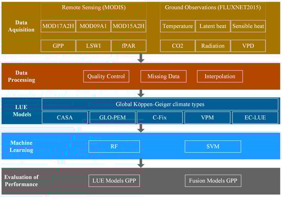 For each forest type (i.e., DBF, EBF, ENF, and MF), the grid-search method was employed to identify the optimum parameters for the RF and SVM. We tried many trees (ntree, from 100 to 1000) and variables sampled as candidates at each split (mtry, from 1 to 5) separately for the RF across each forest type. Similarly, for the SVM, different values of the kernel parameter (gamma, from 0.1 to 10) and the cost of violating constraints (cost, from 0.1 to 10) were tried. The optimum parameters (see Table S4 in the Supporting Information File) were applied to the process of fusing CASA, GLO-PEM, C-Fix, VPM and EC-LUE models together with Köppen–Geiger climate zones. The workflow is shown in Figure 2.