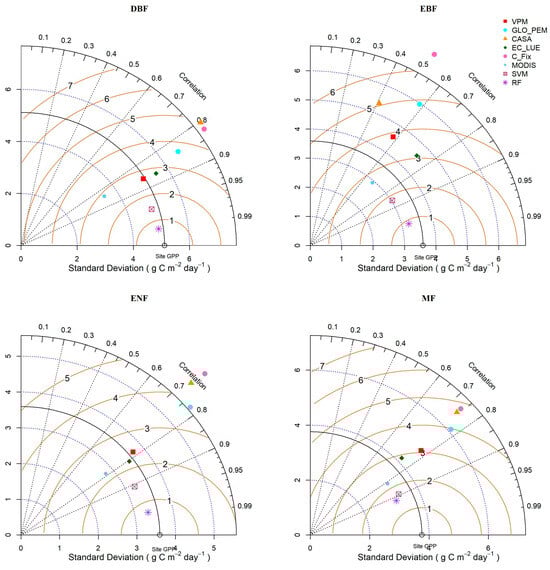 Figure 3 shows Taylor diagrams for the site-derived GPP and estimated GPP using different LUE models at the 45 EC sites. The Taylor diagram is a graph in polar coordinate which includes the metric of standard deviation (SD), the correlation coefficient (R) and the root-mean-square difference (RMSD) between the estimations and the reference values [53]. In Figure 3, SD is the distance from the original coordinate point; R is the cosine of the azimuth angle; and RMSD denotes the distance from the reference value (i.e., FLUXNET2015’s GPP products). Figure 3 indicates that the performance of different LUE models varied across forest types. In the deciduous broadleaf forest (DBF), the VPM estimation was the closest one to site-derived GPP compared to other LUE models including MODIS’s GPP in the dimensions of SD, R, and RMSD. EC-LUE and MODIS held similar R and RMSD but higher and lower SD values compared to VPM. The RMSD of GLO-PEM was higher than that of VPM, EC, and MODIS, while CASA and C-Fix stayed further away from the referenced point (site-derived GPP), which means that CASA and C-Fix ranked lower compared to other LUE models. In the evergreen broadleaf forest (EBF), EC-LUE and MODIS outperformed other LUE models with a lower RMSD, higher R, and closer SD distance to site-derived GPP. In the ENF and MF types, EC-LUE, VPM, and MODIS performed better than GLO-PEM, CASA, and C-Fix.