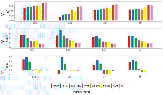 Figure 4 shows that the single LUE models, SVM, and RF exhibited substantial differences for each forest type using R2, RPE, and RMSE compared to ground site-derived GPP. EC-LUE, VPM, and GLO-PEM explained major GPP variations across each forest type, indicated by R2 of 0.62, 0.57 and 0.56, and C-Fix and CASA explained less variations with an average R2 of 0.51 and 0.47. The R2 of MODIS’s GPP was 0.61, only less than EC-LUE, which indicated a good performance compared to other LUE models. The SVM and RF significantly improved the ability to explain variations for each forest type with R2 of 0.79 and 0.80, respectively. The RMSE and RPE describe the errors from estimation, so lower values indicate better performance. In the five LUE models, EC-LUE had the smallest RMSE of 2.77 gC m−2 day−1, while VPM had the least absolute RPE of −0.04, which means EC-LUE and VPM outperformed other LUE models in terms of simulation errors. The RMSE (gC m−2 day−1) and RPE of C-Fix (5.79 and 0.53) and CASA (4.96 and 0.23) were much higher than those of EC-LUE and VPM. MODIS performed well with a 2.55 gC m−2 day−1 RMSE and RPE of −0.11, indicating that it was justifiably trustworthy as a popular worldwide research product. VPM, EC-LUE, and MODIS, as the better performance models, underestimated GPP compared to site observations. The SVM and RF decreased the RMSE (gC m−2 day−1) to 1.75 and 1.72, and RPE to −0.01 and 0, respectively, which further demonstrated that machine learning could significantly improve GPP simulation capabilities.