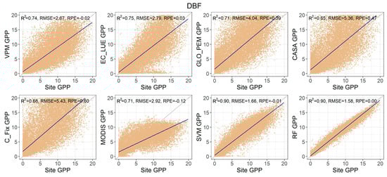 The scatter plots of R2, RMSE, and RPE across the DBF between site-derived GPP and the estimates from the LUE models, MODIS, SVM, and RF.