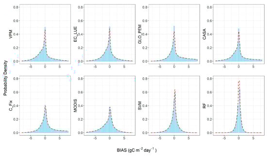 Figure 6 shows the probability distribution of the predictive error in LUE models, MODIS, SVM, and RF compared to FLUXNET2015’s GPP product. The VPM, EC-LUE, and GLO-PEM models had maximum value that centered on the x axis origin with thicker tails on the left hand, which showed that these three LUE models underestimated GPP compared to site observations. CASA and C-Fix had lower peaks compared to EC-LUE, VPM, and GLO-PEM, illustrating that the predictive bias from these two models fluctuated more strongly, which may lead to a higher probability of estimation errors. Compared to individual LUE models and MODIS’s GPP product, the GPP error distributions of machine learning estimations were centered on the x axis origin closely, in a narrow range, with explicitly higher peaks and balanced biases on both sides. Therefore, these histograms indicate that the machine learning fusion strategy—especially the RF—were best at explaining the GPP variance.