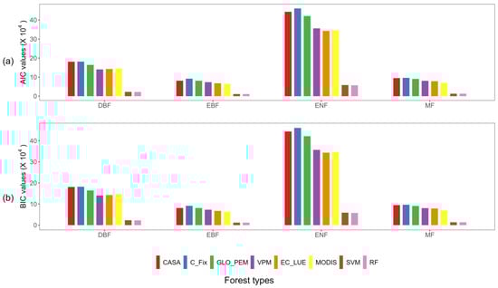 The AIC (a) and BIC (b) of the LUE models, MODIS, SVM, and RF across the DBF, EBF, ENF, and MF.