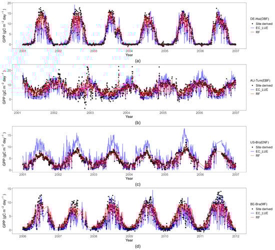 Daily FLUXNET2015’s GPP (black dots), the best LUE model-estimated GPP (EC-LUE, line in blue), and the best fusion method-estimated GPP (RF, line in orange) at 4 sites: DE-Hai of DBF (a), AU-Tum of EBF (b), US-Blo of ENF (c), and BE-Bra of MF (d).
