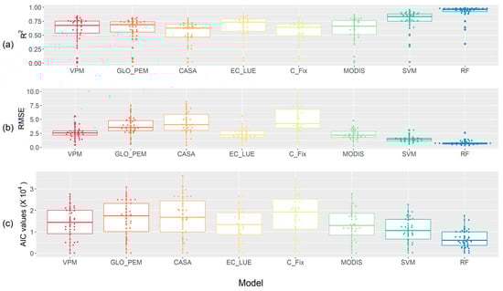 We drew a boxplot of R2, RMSE, and AIC for each LUE and machine learning model across all selected FLUXNET2015 sites. A flat box and narrow range of outliers means reliable model performance in a boxplot. Figure 9 shows that EC-LUE and VPM outperformed other LUE models, while the SVM and RF could improve GPP estimation accuracy significantly. The RF had flatter boxes and a narrower outlier range than the SVM, especially an obvious distribution of a higher R2 and a lower RMSE and AIC compared to that of the SVM, which indicated the RF was a better machine learning method to simulate forest GPP in this study.
